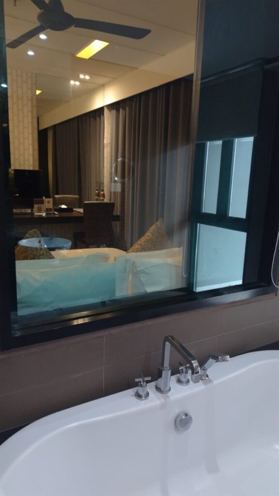 バスルームに向かって左側の、バスタブ横のブラインドを開けると、ベッドルームが見えます。