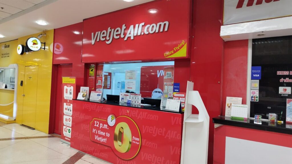 このベトジェットブースは、国際線チェックインカウンターから徒歩数分。国内線に向かう途中にあります。